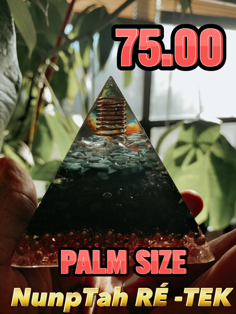 The Orgone Pyramid By NunpTah RE TEK Is Composed Of The Dark Matter Mix; ( Shungite, Black Obsidian, Black Tourmaline, & Black Sand. Along With Metal Sand Of Atomicised Inorganic Metals i.e.; Steele, Iron, Aluminimum, Copper, and TIN. It Also Includes A Copper Based Bottom and A Neodymium Coated Rare Earth Magnet In It's Center. Along WIth A Quartz Crystal and Accompanied By An Additional Crystal or Two Of Your Choice. These Generators Nullify and Eradicate The Chemtrails and Radiation In Your Immediate Environment. 7 miles In Every Direction At Full Size. The Mid SIze and Palm Size Facilitate The Personal Space 6 - 15 feet In Every Direction. Improving Sleep Quality and Enhancing Meditation and Magnifying Ones Ability To Access and Output The Wisdom Recieved. Thoughts Words and Actions, Activities, and Activision Is Magnified While In Possession Of The Pyramid. So Please Be Very Attentive Of What You Speak, For Good Bad Or Indifferent It Will Be Magnified In Its Presence.